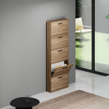 Meuble à chaussures étroit et peu encombrant avec 5 portes battantes, couleur noyer naturel. Design compact et moderne, idéal pour les entrées et les couloirs. Peut contenir jusqu'à 15 paires de chaussures.