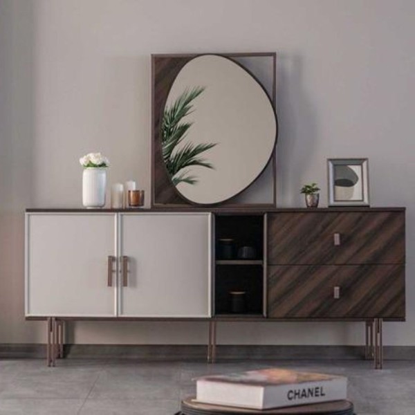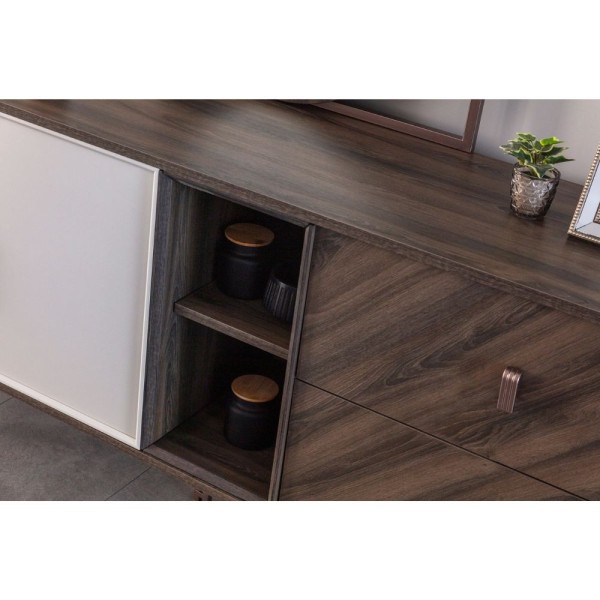 Le buffet Merlin de Toscohome est un meuble élégant et fonctionnel avec deux portes et deux tiroirs pour une excellente organisation de l'espace. La finition Mozambik spatulée apporte une touche de classe à la pièce.