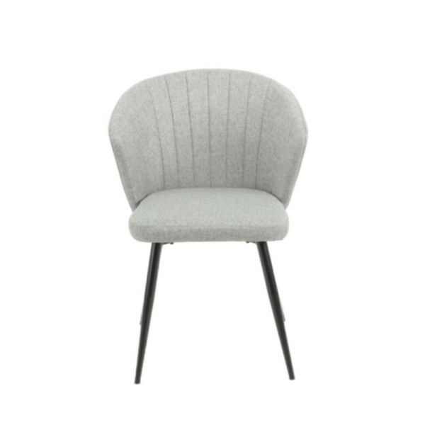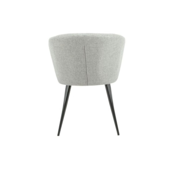Chaise Falya recouverte de tissu gris cendré et pieds en métal noir. Design moderne et chaleureux, parfait pour la salle à manger, le salon ou les environnements professionnels.