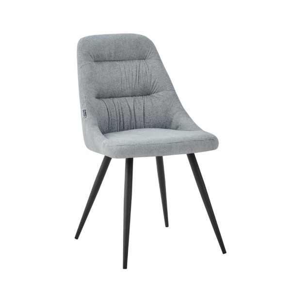 Chaise Falya recouverte de tissu gris cendré et pieds en métal noir. Design moderne et chaleureux, parfait pour la salle à manger, le salon ou les environnements professionnels.