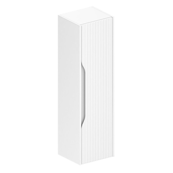 Colonne de salle de bains murale Gaper 35x30x120H cm en blanc mat, avec façade à effet nervuré. Pratique, élégante et peu encombrante, elle est idéale pour les environnements modernes et minimalistes.