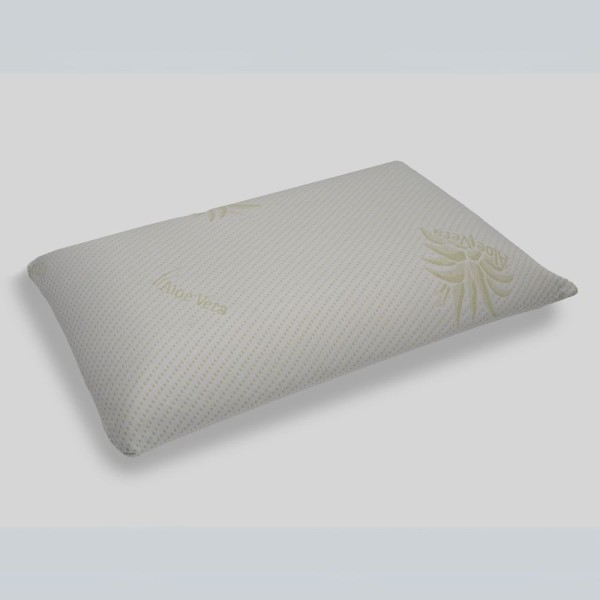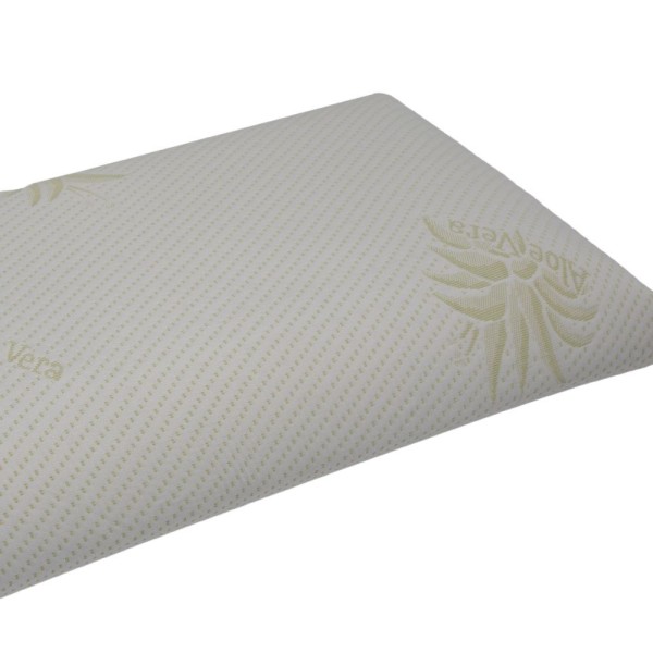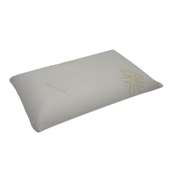 Oreiller orthopédique en mousse à mémoire de forme avec aloe vera, idéal pour un repos régénérant. Taie d'oreiller blanche amovible et lavable. Dimensions : 72x42x13 cm. Confort et hygiène garantis.