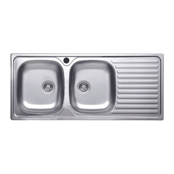 Évier de cuisine en acier inoxydable avec deux cuves et égouttoir à droite. Robuste, pratique et durable, il mesure 116x50 cm. Parfait pour les cuisines modernes et fonctionnelles.
