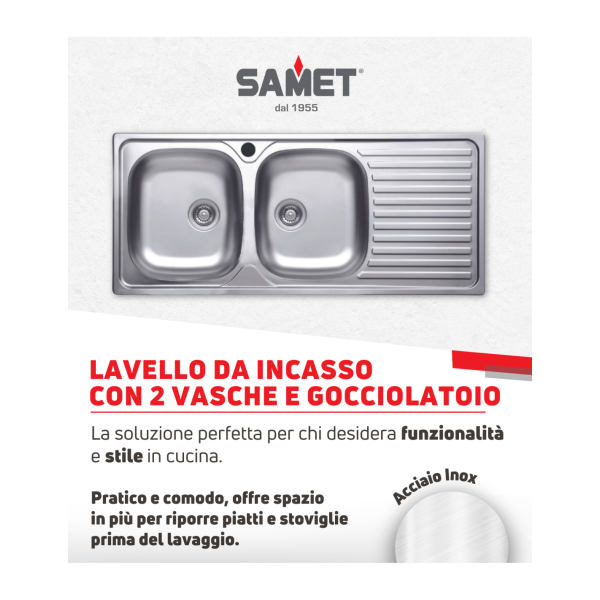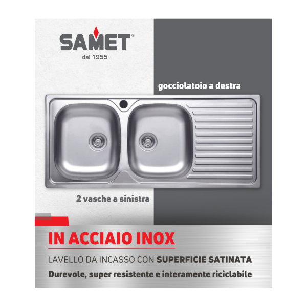 Évier Samet SAXT3 avec double cuve et égouttoir à gauche, dimensions 116x50 cm, idéal pour une cuisine fonctionnelle et moderne.