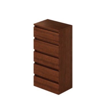 Commode assemblée avec 5 grands tiroirs, finition noyer naturel. Elégante, robuste et peu encombrante, elle est idéale pour la chambre à coucher ou le hall d'entrée. Dimensions : 47x127H cm.