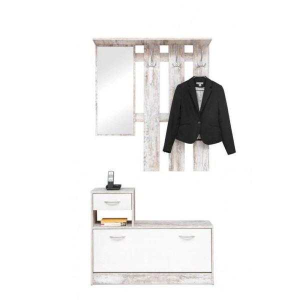 Meuble d'entrée 100x180H cm avec miroir et portemanteau en blanc usé - Rudolf