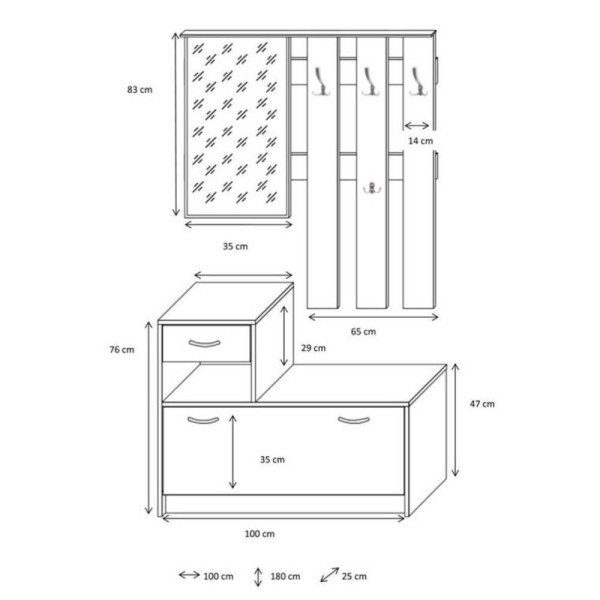 Armoire d'entrée 100x180H cm avec miroir et porte-manteau en blanc usé - Rudolf L'armoire d'entrée Rudolf est la solution idéale pour garder l'entrée de votre maison bien rangée. D'une largeur de 100 cm et d'une hauteur de 180 cm, cette armoire dispose d'un grand miroir pour vérifier votre look avant de sortir, d'un espace de suspension pour les vestes et les manteaux, et d'un porte-chaussures pour un rangement ordonné. Elle est fabriquée avec des matériaux de haute qualité et présente une finition élégante qui s'intègre parfaitement à tout type de décor. Avec Rudolf, vous aurez toujours un hall d'entrée confortable et bien rangé. Caractéristiques : |