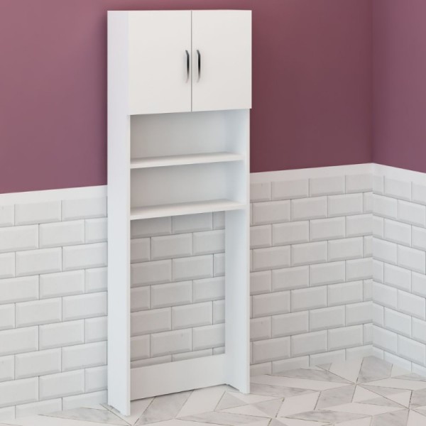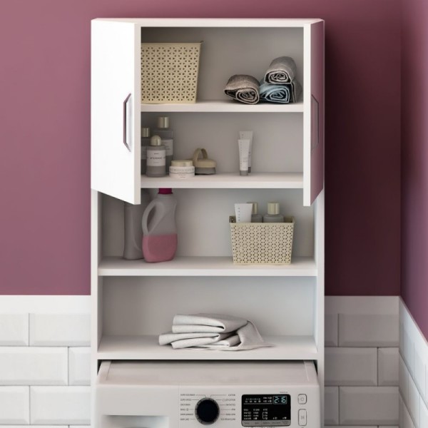 Découvrez l'armoire de rangement pour lave-linge Waris de Toscohome : élégante et fonctionnelle, avec portes et étagères. Couleur blanche, dimensions 64x180 cm, idéal pour organiser et cacher la machine à laver avec style.