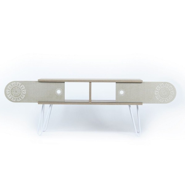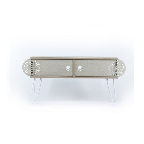 Le meuble TV Aldo de Toscohome est élégant et fonctionnel, avec des portes et des tiroirs pour organiser les objets et un compartiment ouvert pour les appareils multimédia. Couleur cachemire, longueur 182 cm.