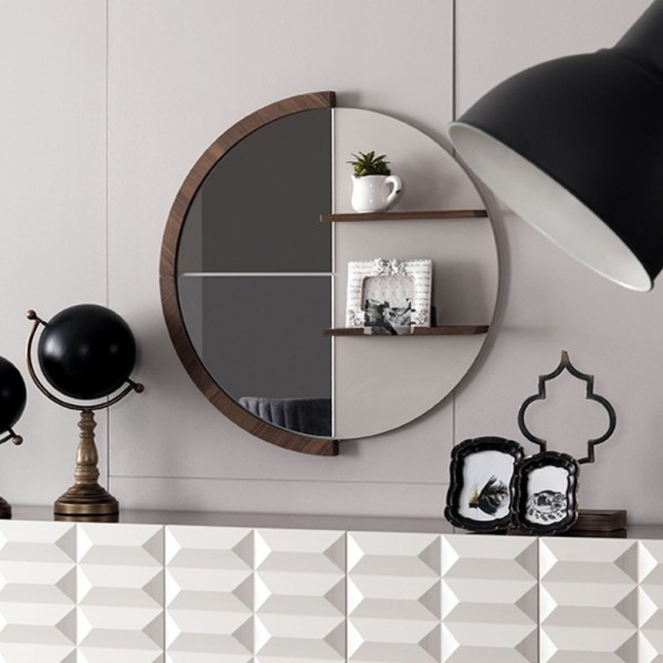 Miroir rond avec étagères en bois naturel Diana Miroir rond avec verre fumé et deux étagères. Un accessoire d'ameublement qui enrichira et personnalisera avec goût votre séjour. Idéal pour meubler votre salon, salle à manger ou lounge avec une élégance raffinée. Caractéristiques :
