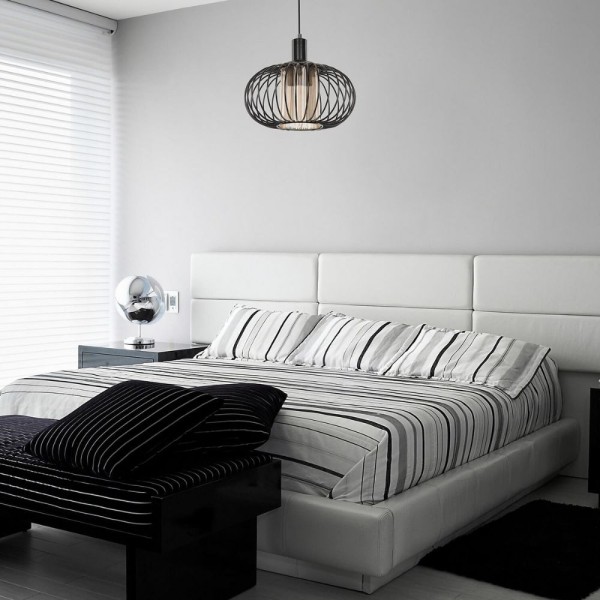 Lampe de plafond noire avec des détails en corde dans un design rétro et raffiné. Idéal pour créer une atmosphère chaleureuse et vintage.