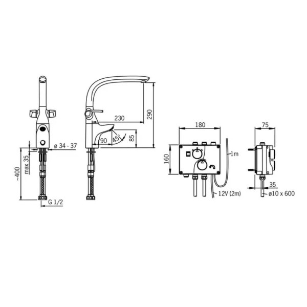La température de l'eau pour la fonction sans contact est réglée par une unité de commande située sous l'évier. L'unité de commande est équipée d'un raccord pour lave-vaisselle. Des options d'eau chaude et d'eau froide sont disponibles pour le lave-vaisselle. Les valeurs prédéfinies pour l'intervalle de reconnaissance et la période d'écoulement sont réglables sur place. Raccordement électrique avec transformateur enfichable 230/12 V. Tuyaux de raccordement ø10 x 600 (2 pièces) entre les tuyaux d'entrée et l'unité de commande. Le robinet est équipé de filtres à litière et de clapets anti-retour.