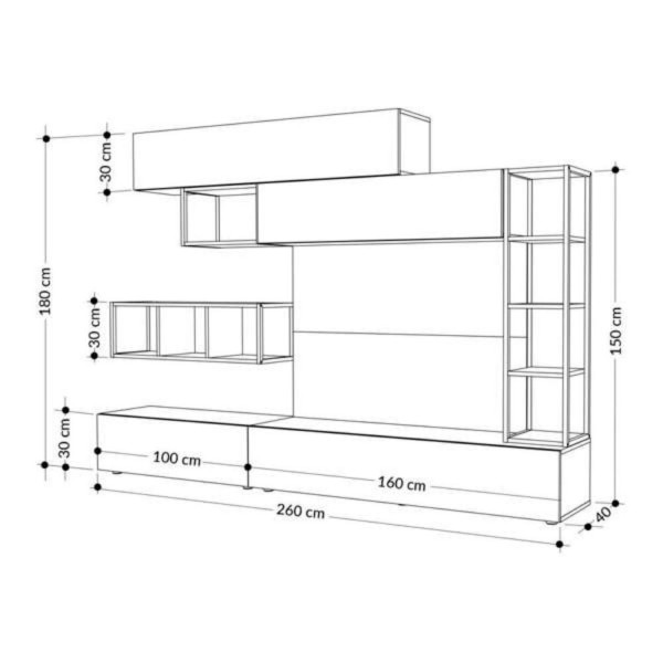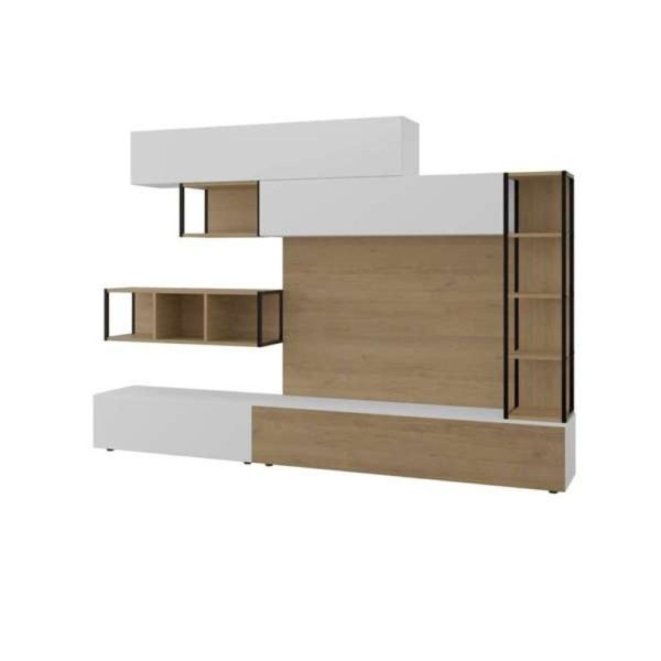 Meuble mural moderne et fonctionnel de 260 cm de long en finition blanc et chêne. Idéal pour meubler le salon avec style et praticité.
