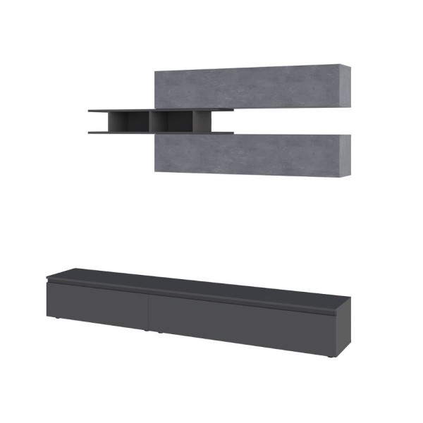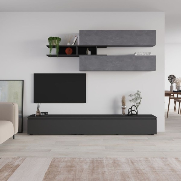 Meuble mural moderne et fonctionnel en gris oxyde et beton, d'une longueur de 277 cm. Idéal pour meubler votre salon avec style et praticité.