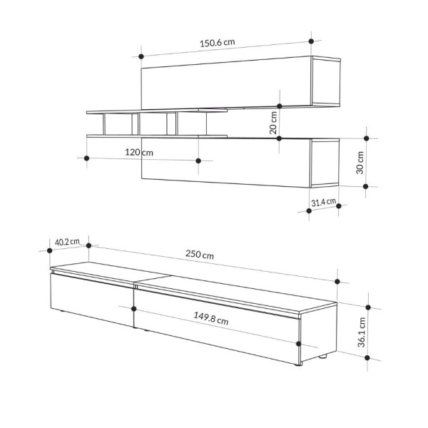 L'élément haut de 300 cm anthracite et gris tourterelle avec des détails en noyer, avec son design moderne et fonctionnel, est parfait pour meubler votre salon avec style.