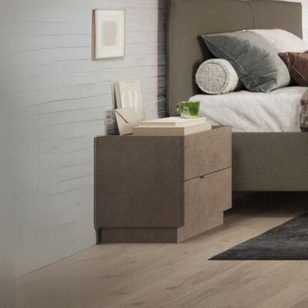 La table de chevet Ema est élégante et fonctionnelle, avec une porte à rabat qui permet de cacher des objets personnels. La couleur gris tourterelle s'adapte à tous les décors.