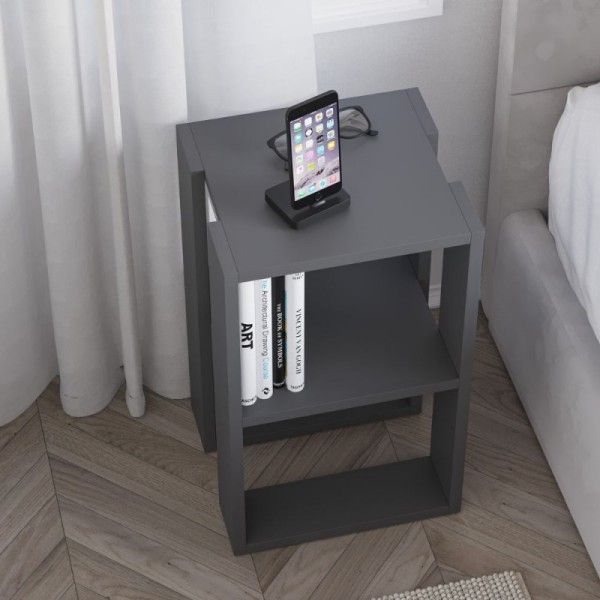 Table de chevet moderne et fonctionnelle avec deux étagères, au design élégant et polyvalent, parfaite pour meubler la chambre à coucher dans un style contemporain.