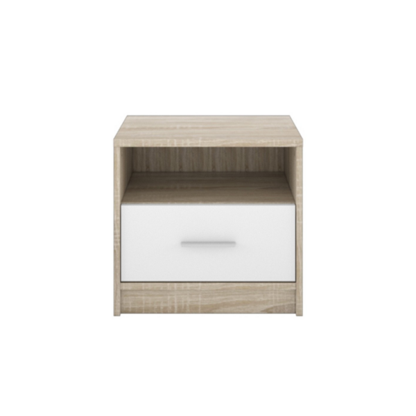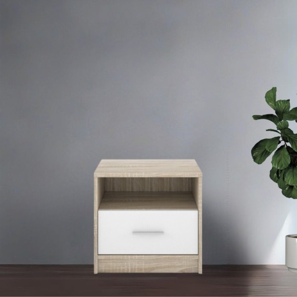 La table de chevet Nepo présente un design moderne et minimaliste avec un tiroir spacieux et une élégante couleur chêne blanc sonoma.