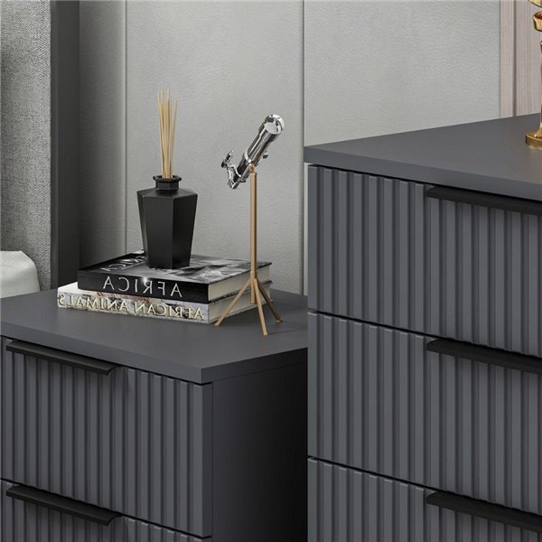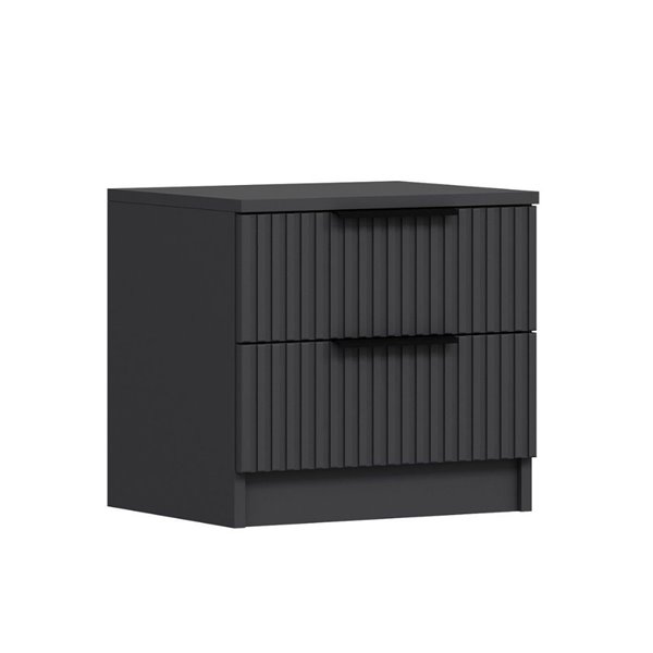 Table de chevet Wilmy anthracite avec deux tiroirs, finition effet nervuré. Elégante et compacte, elle mesure 50x40x47H cm. Parfaite pour les chambres modernes et les designs raffinés.