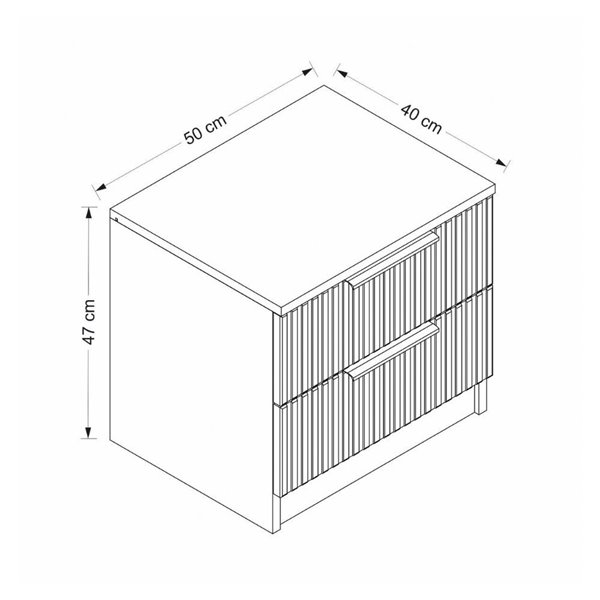 Table de chevet moderne avec deux tiroirs, finition cachemire et façades à effet nervuré. Elégante et fonctionnelle, elle est parfaite pour compléter la chambre à coucher avec style et praticité.