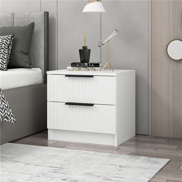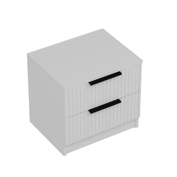 Table de chevet moderne avec 2 tiroirs, finition blanche. Compacte et pratique, idéale pour les chambres à coucher contemporaines. Dimensions 49x41H cm. Ligne Manitoba.