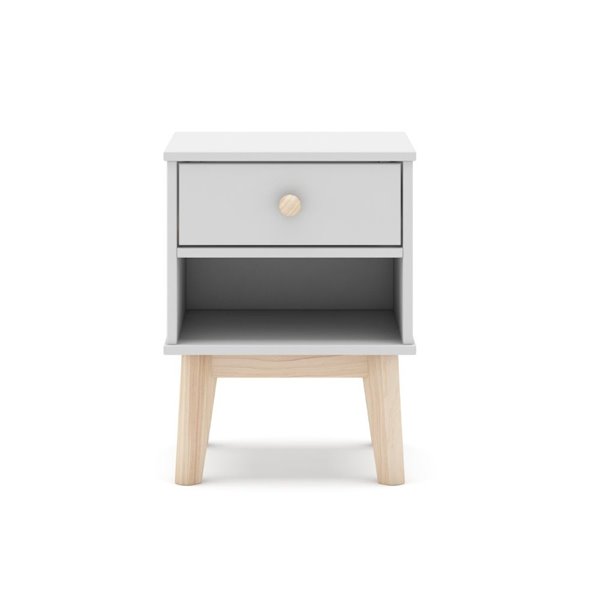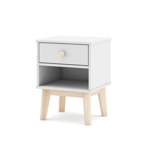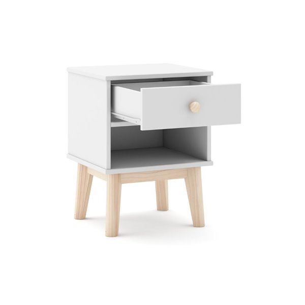 Table de chevet en bois massif avec tiroir, finition blanche. Idéale pour les chambres à coucher modernes et classiques. Dimensions compactes : 40x35x53H cm. Robuste, élégante et fonctionnelle.