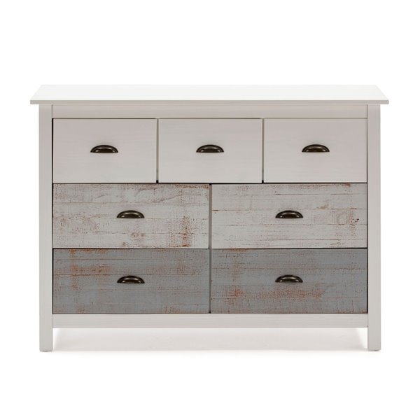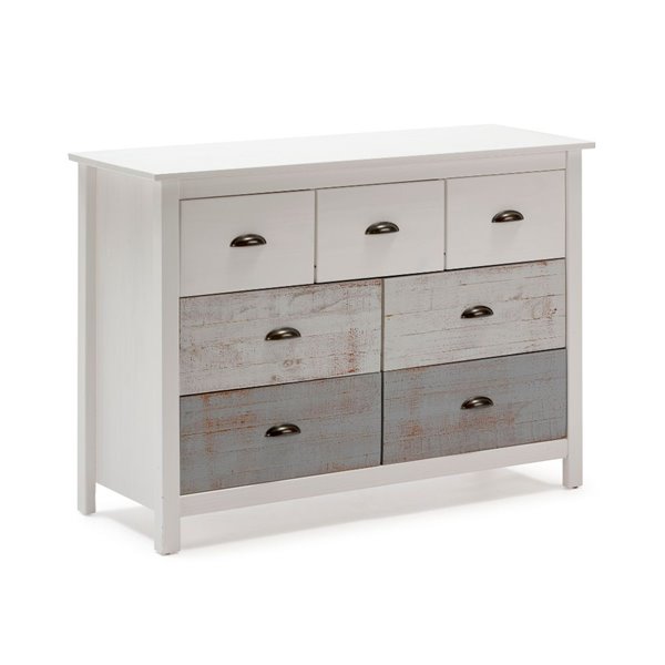 Commode en bois massif de style romantique avec 7 grands tiroirs. Élégante finition blanche et grise, idéale pour meubler avec charme et fonctionnalité les chambres à coucher ou les halls d'entrée.