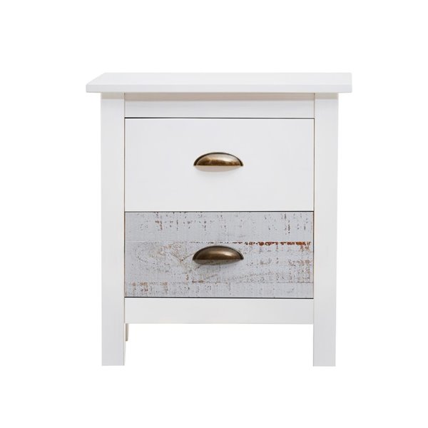 Table de chevet en bois massif avec finition blanche et grise, style romantique et raffiné. Idéal pour la chambre à coucher, avec tiroir et compartiment de rangement.
