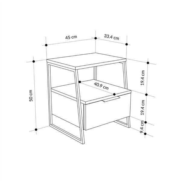 Table de chevet compacte avec tiroir et deux étagères ouvertes, finition sable. Dimensions 45x41x50 cm, idéal pour les chambres modernes et les petits espaces.
