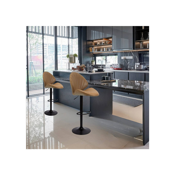 Tabouret de bar en similicuir camel avec structure en métal noir solide. Design moderne et confortable, parfait pour les cuisines, les péninsules et les environnements contemporains.