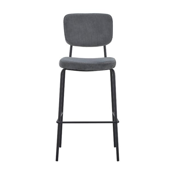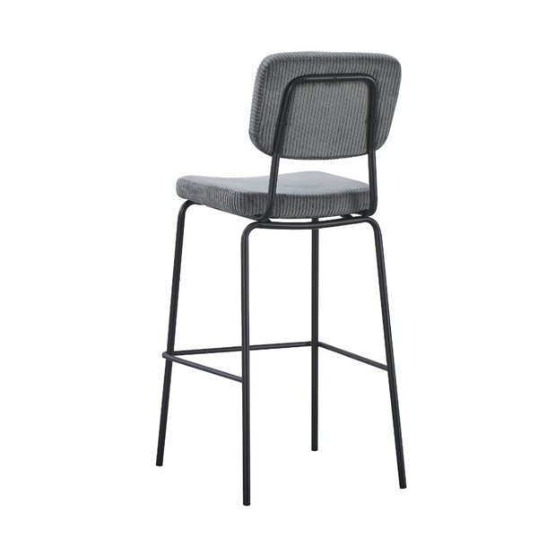 Tabouret Rory avec assise rembourrée en gris cendré et pieds en métal noir. Elégant et confortable, il est parfait pour les cuisines modernes, les comptoirs et les environnements de design contemporain.